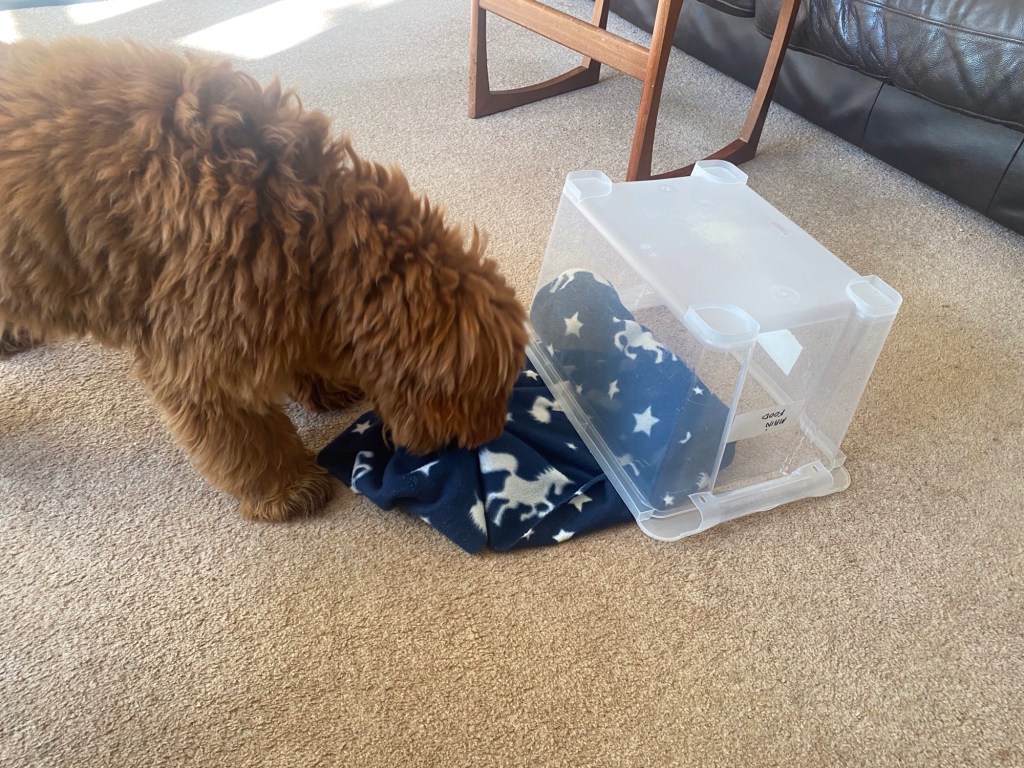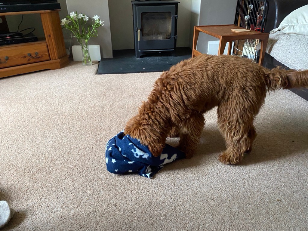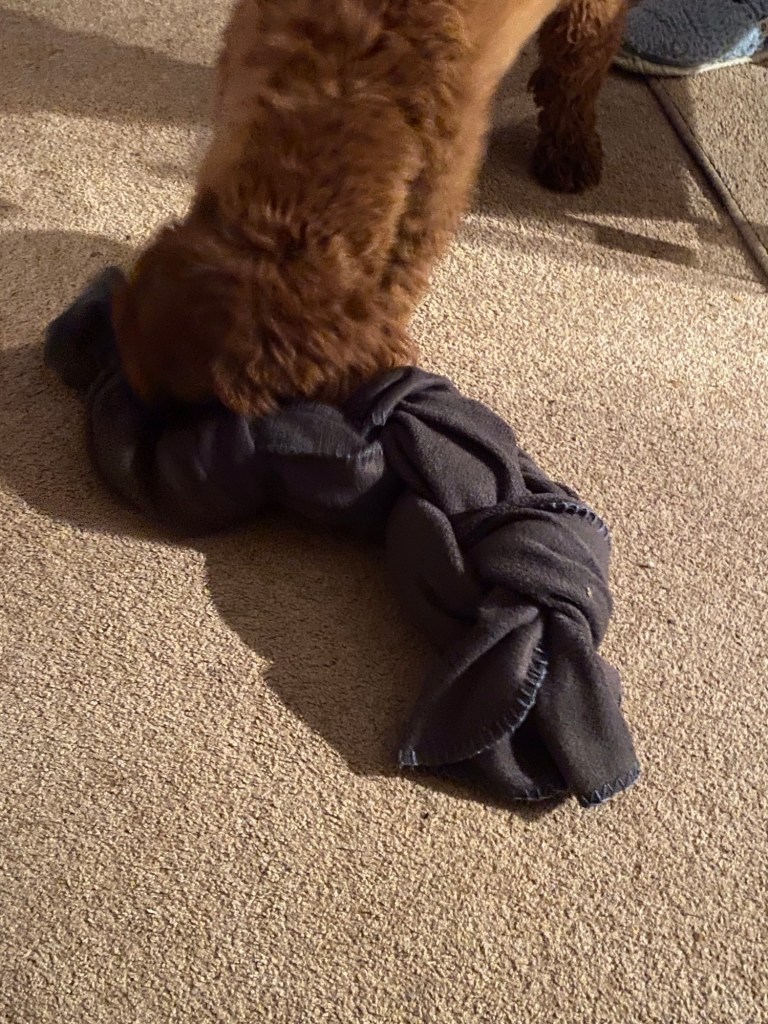 14. The first and simplest idea was wrapping up treats in a blanket – and she already had her own blanket from her breeder. Months later we have progressed to tying knots and this prolongs the trick (a little). I also use large fleeces.