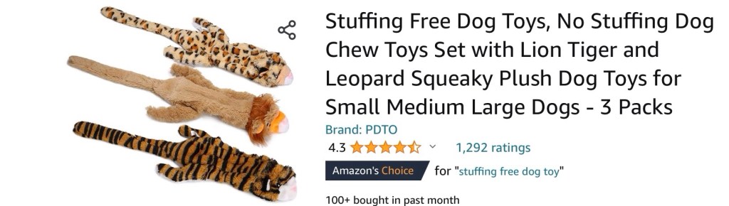 I also like tug toys that don’t have any stuffing in to start with. These were very good value.