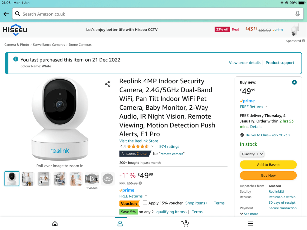 7: This Reolink camera was easy to set up, and somehow, I don’t know how, it works on a mobile phone signal for when we are out of the house. It has proved invaluable to know that Tilly is safe when we are upstairs or out of the house. It also has infrared for when it is dull or dark.