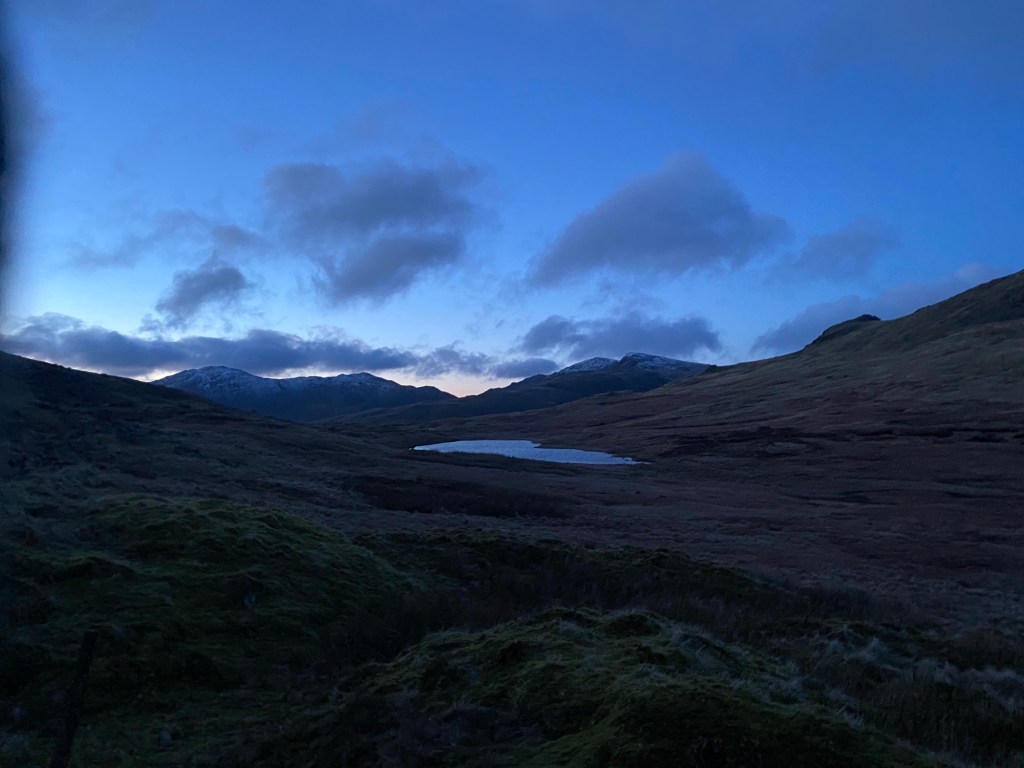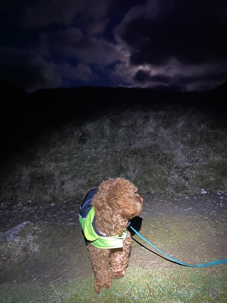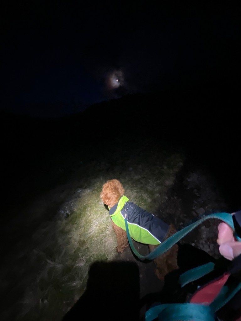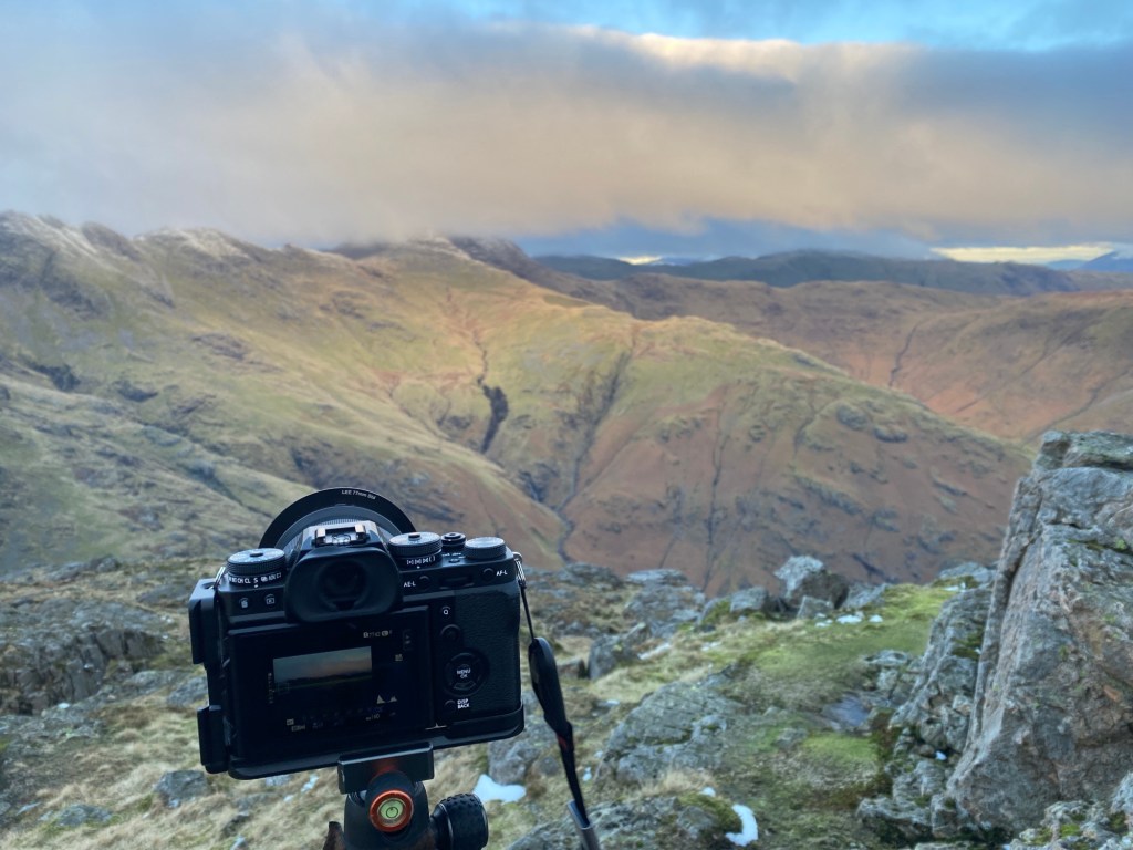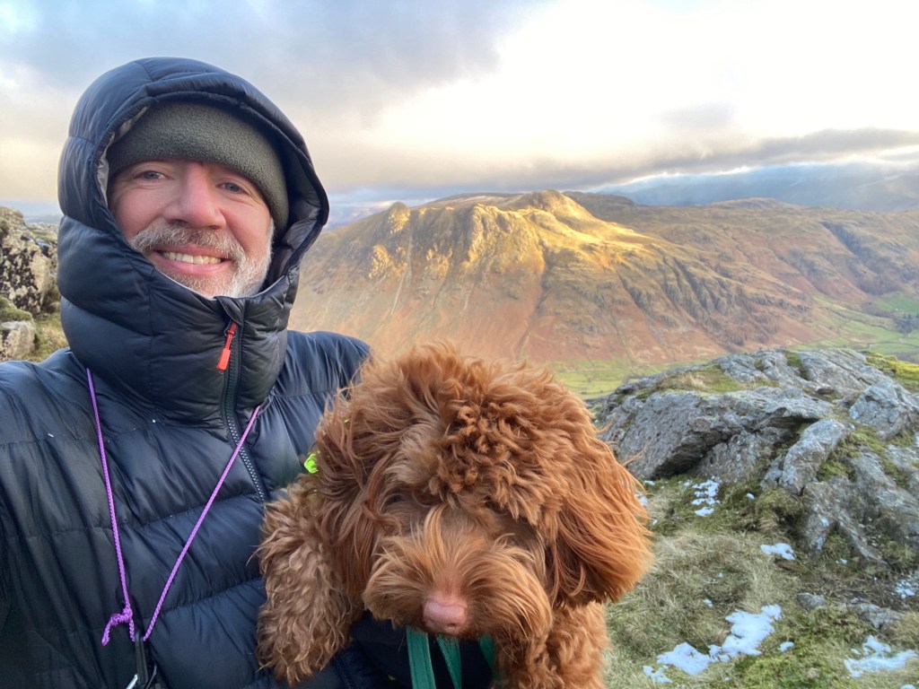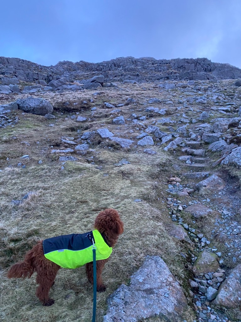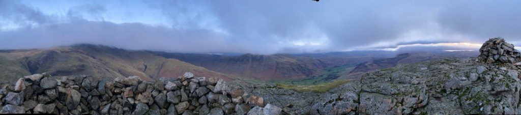 It was dark as we set off. Although there was a full moon. You could see where the Sun was going to appear from.We turned right at the T junction beyond Red Tarn. Nearly at the top…What a view. It was very windy. You can see the band… just not the Crinkles or Bow Fell. Love this selfie with the Langdale Pikes in the background. The light was amazing and there were showers across Greater Langdale. PoB is in the centre, in the distance. An hour’s walk to the top.