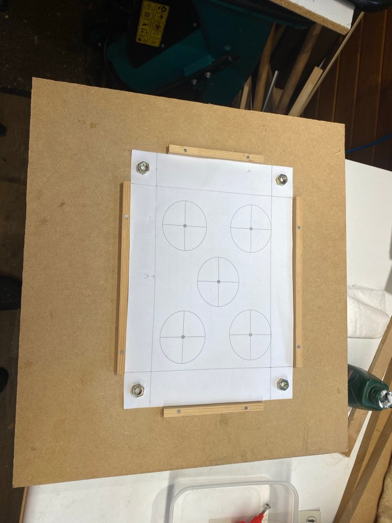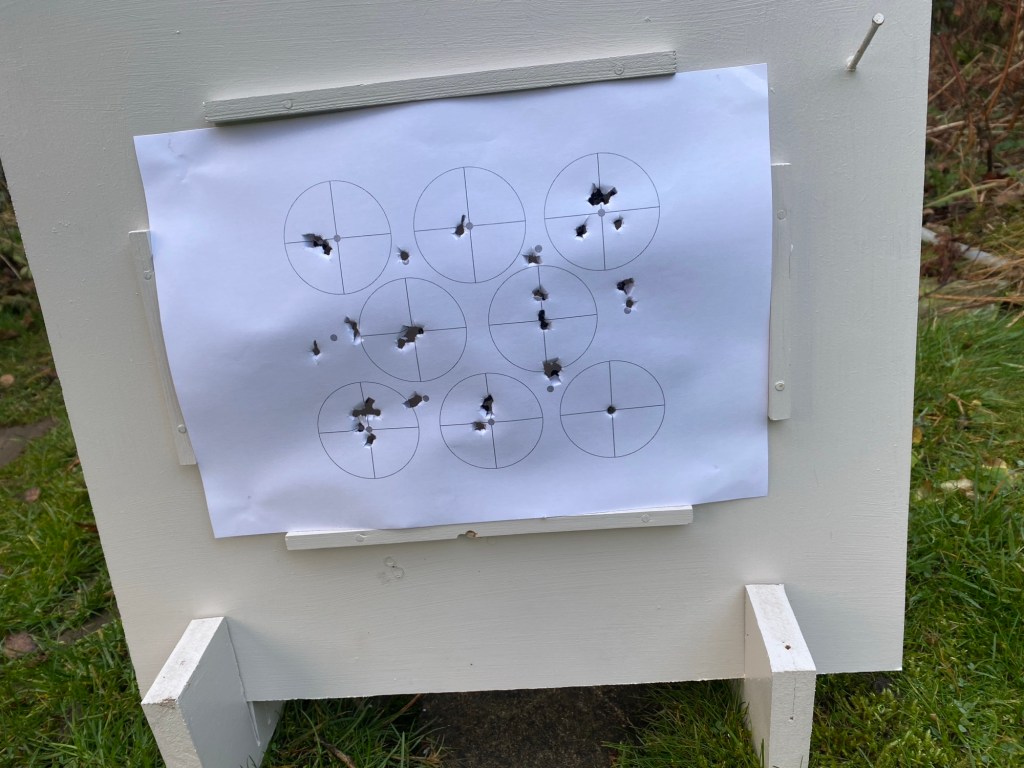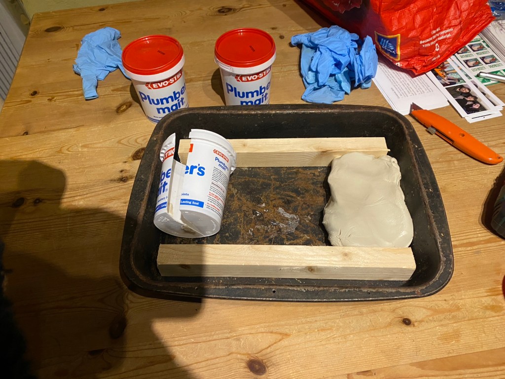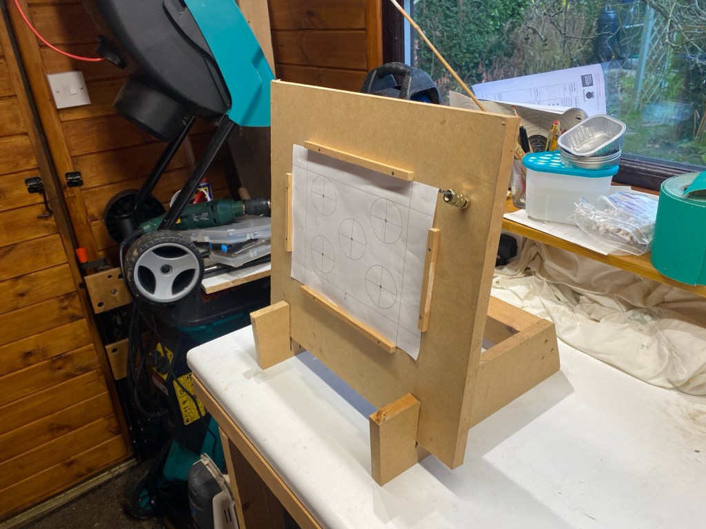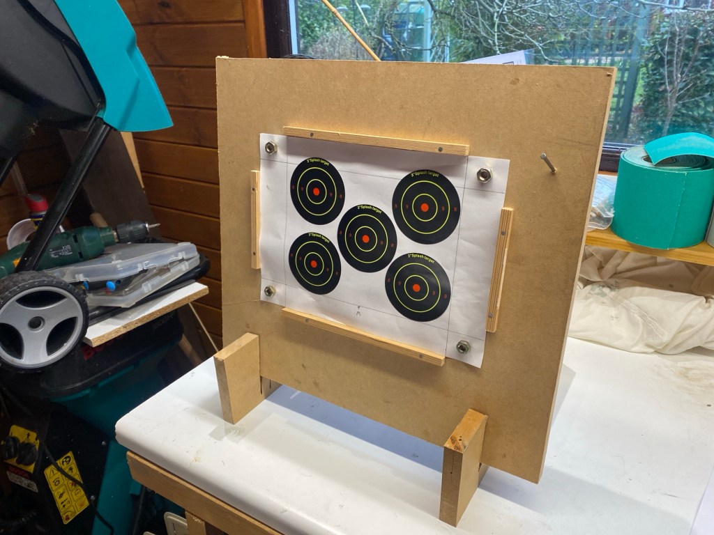 I already had an old roasting tray, so liked the idea of using plumbing putty. Working on a template of an A4 piece of paper, I used wood strips to reduce the volume of putty needed in the tray. I used 4 tubs of Plumber’s Mait to create at least an inch depth. 177 pellets go in about 3 pellets’ depth at 25 yds.