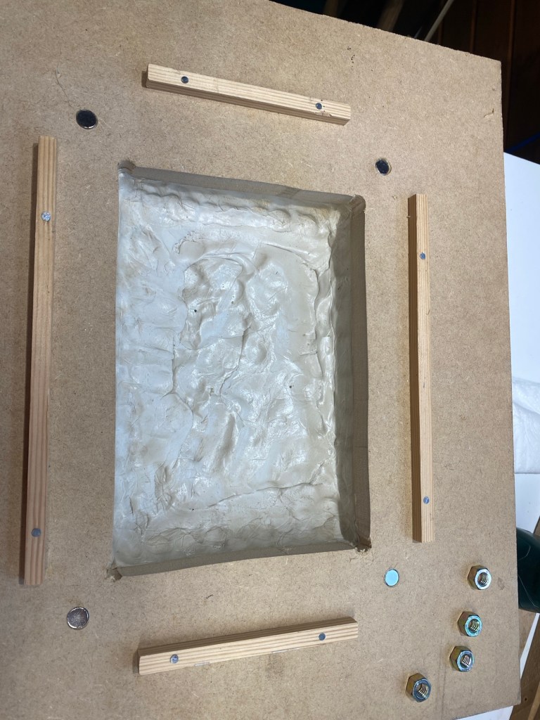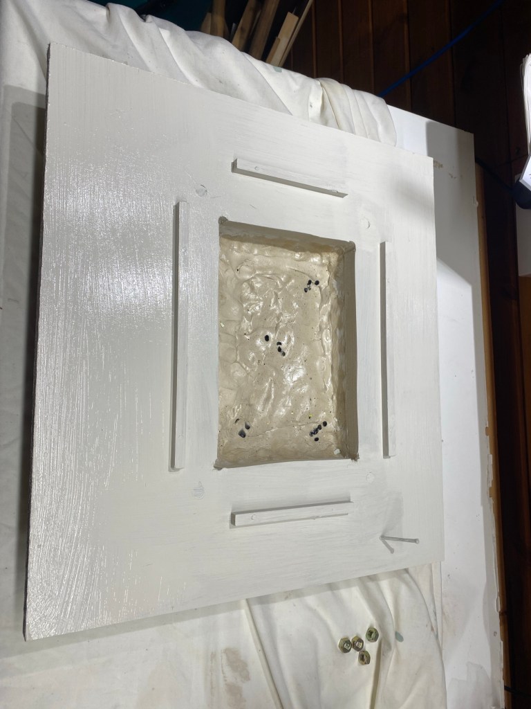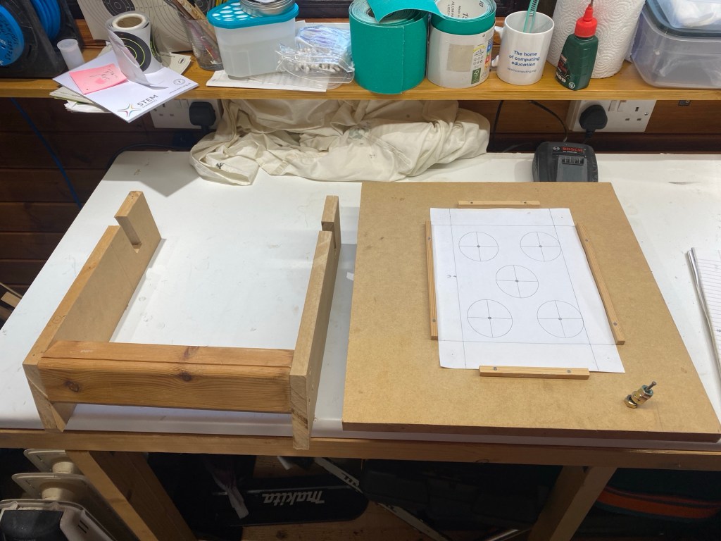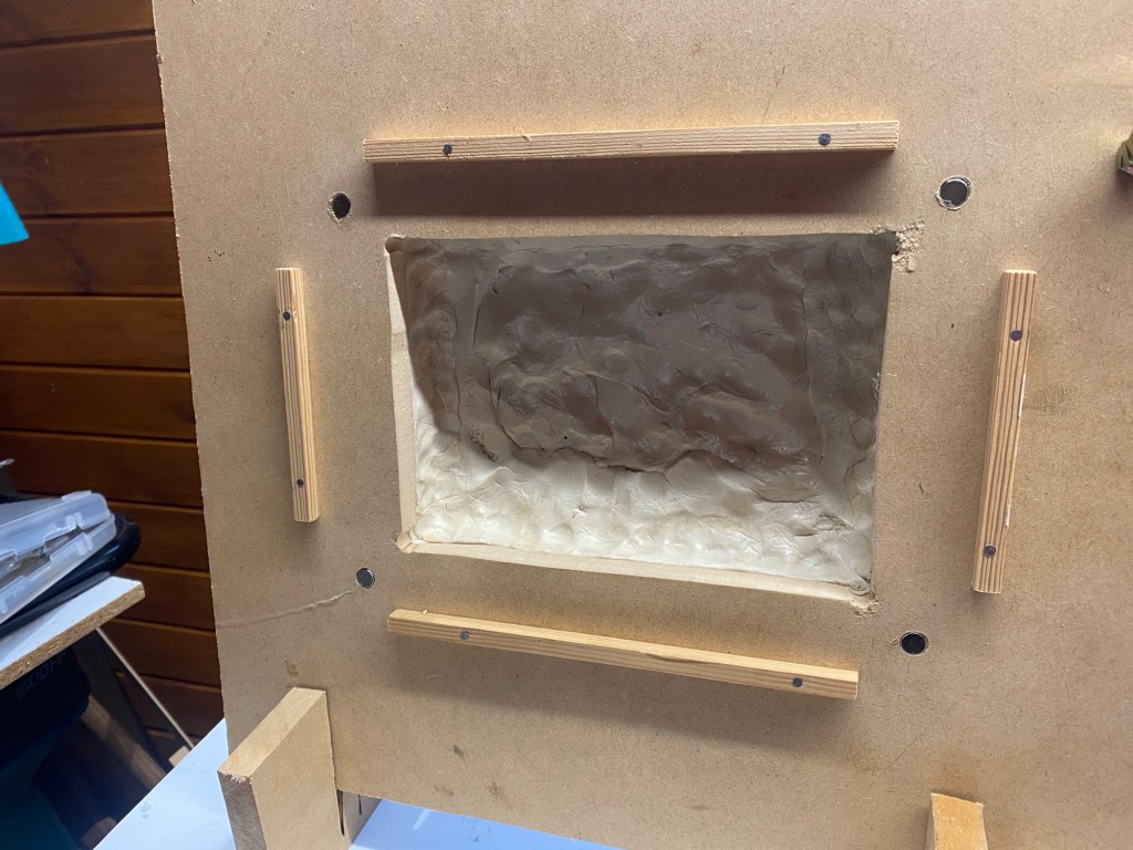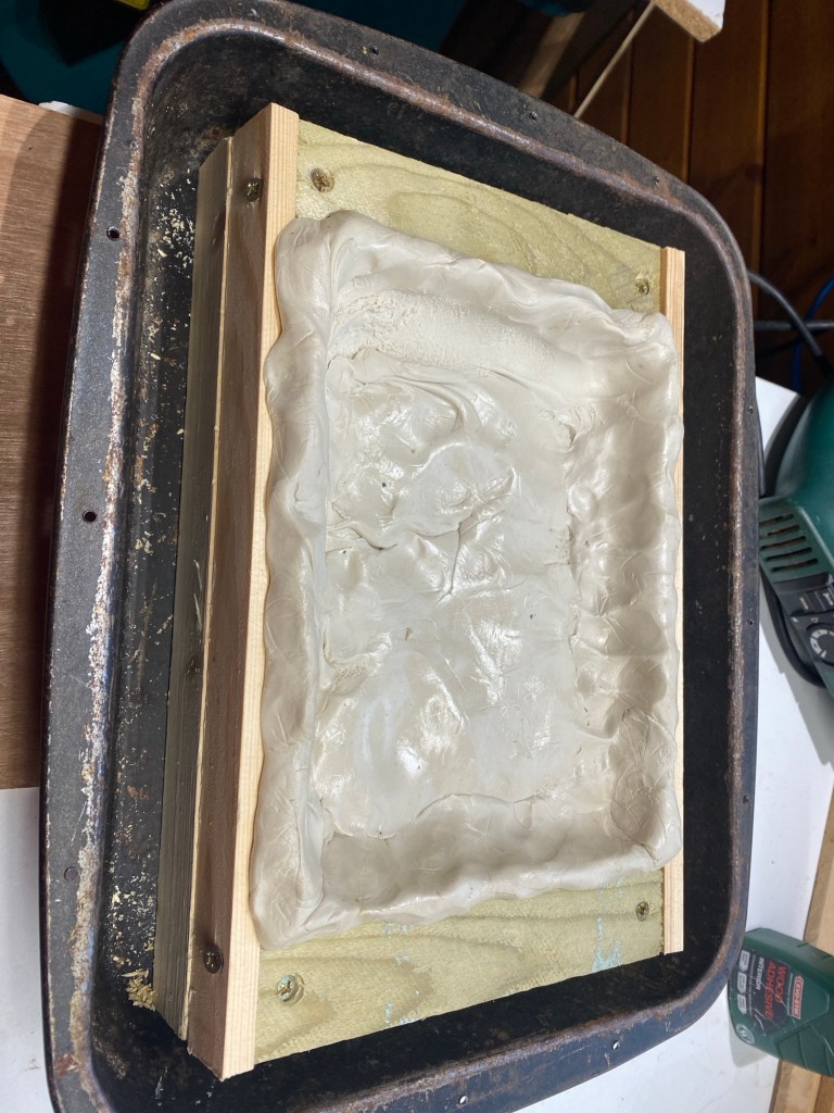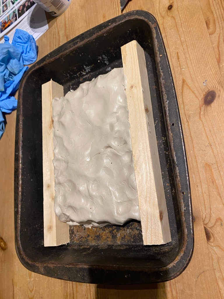 I already had an old roasting tray, so liked the idea of using plumbing putty. Working on a template of an A4 piece of paper, I used wood strips to reduce the volume of putty needed in the tray. I used 4 tubs of Plumber’s Mait to create at least an inch depth. 177 pellets go in about 3 pellets’ depth at 25 yds.